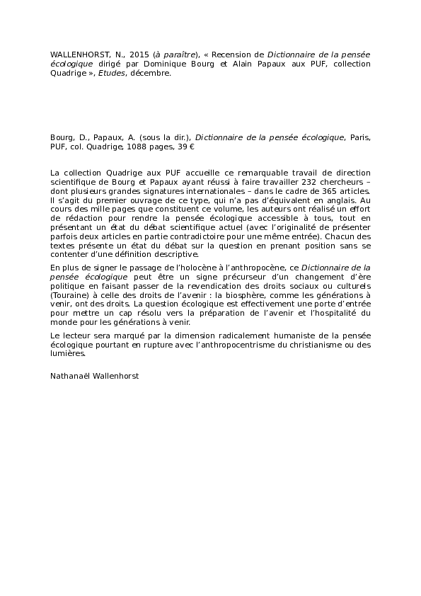 Doc Recension Dictionnaire De La Pensee Ecologique In Etude 2015 12 Nw Nathanael Wallenhorst Academia Edu