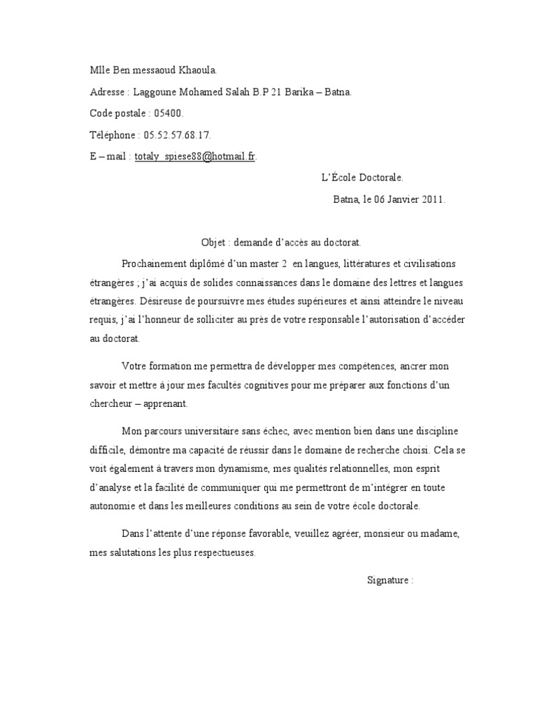 Lettre de motivation école doctorale. Exemple de lettre de motivation. Chaque dossier de candidature pour préparer son doctorat doit comporté une Lettre de motivation. Pour mettre les chance de votre côté envoyez une candidature comportant vos résultats svcolaire une lettre de motivation destinée à lécole et un CV à jour.