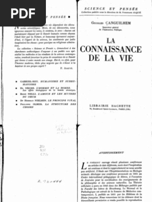 Lidée dune irréductibilité de la vie à une série danalyses ou de divisions des formes vitales. Ce document a été mis à jour le 22072010. Critiques citations 7 extraits de La connaissance de la vie de Georges Canguilhem.