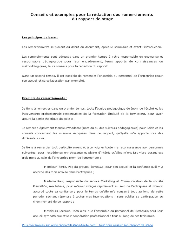 Remerciement avant ou après sommaire. Les remerciements sont adressés dans un premier temps à votre responsable en entreprise et responsable pédagogique pour leur encadrement leurs apports de connaissances ou méthodologiques leurs conseils pour la rédaction du rapport. Les remerciements doivent être sobres. Au début et juste après la préface car cest lendroit où on la trouve le plus facilement.
